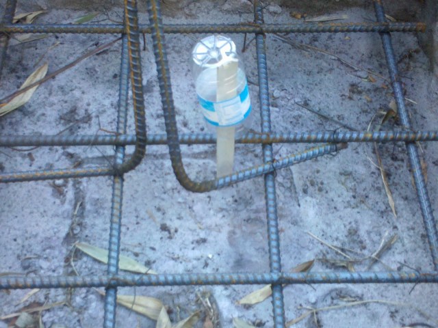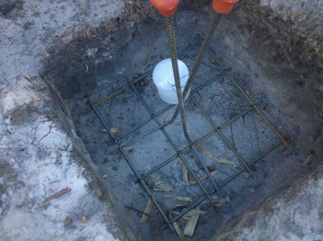 The holes are ready for cement, I think. We had our first inspection so maybe something more will happen this week. Not sure what the plastic bottles are signifying – they’re placed over a white stick-like thing. I’m clueless.