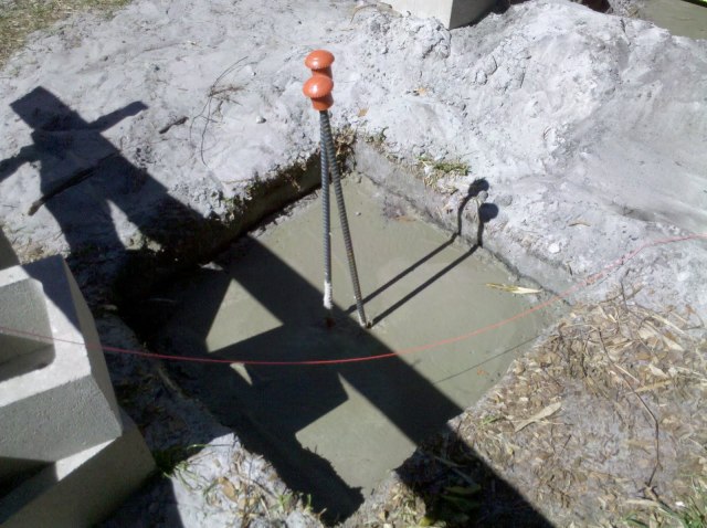 As you can see the cement was poured today – this morning actually. I asked Adam, one of the workers, what the white stick thing was for. He said the top of represented the pour line – the bottles were placed on it to protect our doggies if they happened to fall in a hole. Mr Contractor is a dog lover, too.