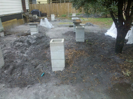 You may notice that in the picture above the nearest pier appears out of alignment. It is. We asked Adam why it was that way. He indicated that when they were digging the first hole they ran into a drum of unknown size and depth. Therefore, with the approval of the engineer, they re-positioned the hole and pier. The make-shift frame and strings are gone. Things are shaping up nicely.