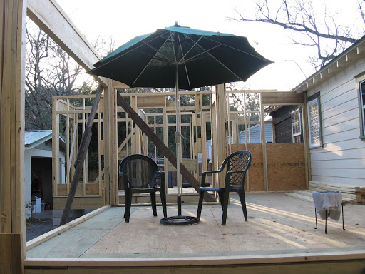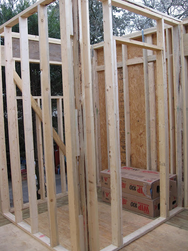 More framing was done today – above is a picture of our new walk-in closet. Below Sydney and Boxer are checking out the new bathroom. Bad news: looks like the sink we picked out may be too wide – so we have two options -choose a smaller sink or Mr. Contractor will move our wall out about six inches. Ain’t he the sweetest?! Tonight I’ll search for a replacement, but if I don’t find one then the wall will come out a little bit. My other homework due Wednesday is to get the specs for the new washer and dryer so he can build our utility closet with the correct dimensions. Note that the utitlity closet is something we added recently and wasn’t in the plans.