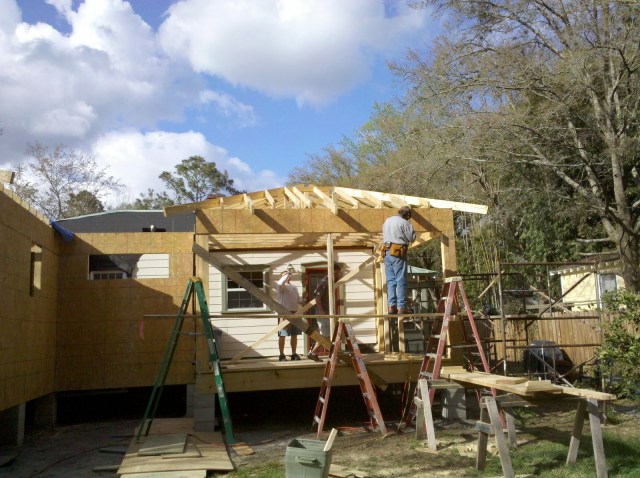 Stood under the roof of my porch..Hmm…my porch…I like the way that sounds. Our neighbor Tom came over to peruse the work in progress and seemed pleased with what he saw. He said something about it being “tight”. Not sure what that means but I am certain it was a compliment.