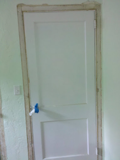 Below is the original inside door to the bedroom. We’ve removed the casing and are going to use it for the new door that’s going into the hallway. This existing door will be trimmed just like the other new doors in the room – consistency is the buzz word here.
