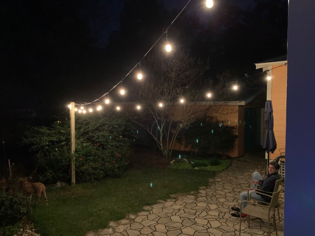 We have our light string hung and powered by a new box installed in the back yard.